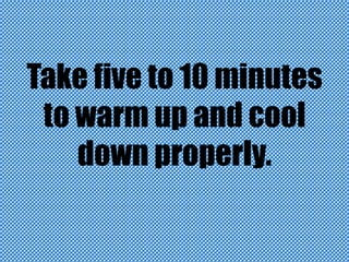Exercise safely by warming up for 5-10 minutes before and cooling down afterwards. Stay hydrated by drinking plenty of water and dress appropriately for your activity in clothes and shoes made for exercise. Also dress in layers for cold weather workouts and don't forget gloves to avoid injuries or hypothermia.