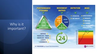 This document discusses motor learning and improving movement patterns through exercise. It states that motor learning involves three phases: cognitive, associative, and autonomous. The goal of motor learning is to perform tasks without needing feedback. It then discusses a case study where an athlete improved their posture through 3000 repetitions of different standing, sitting, and movement exercises over 15 days. Consistent movement patterns through exercise can lead to benefits like improved performance, reduced injury risk, less pain, quicker recovery times, easier movement, optimizing energy usage, and increased mental clarity.