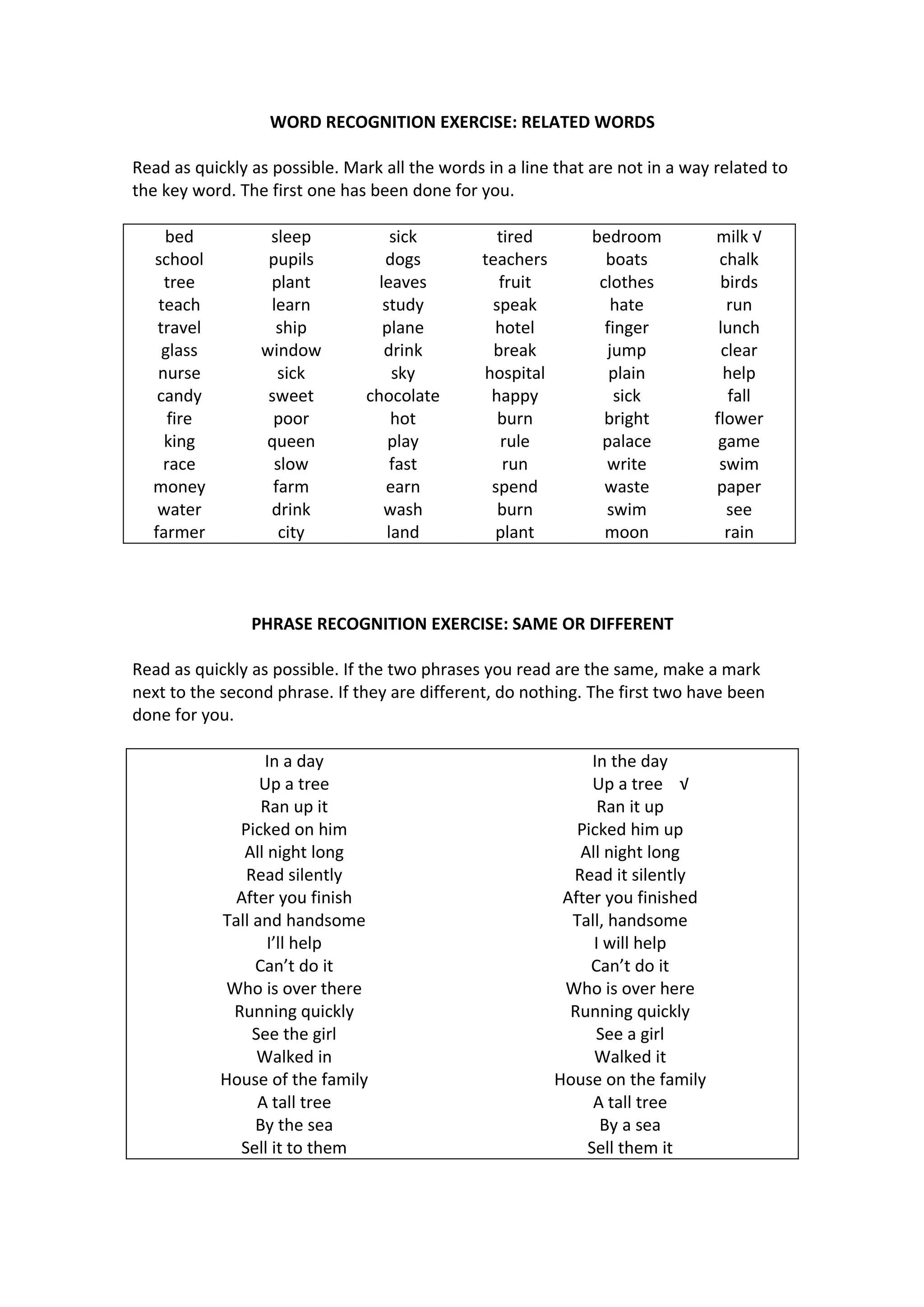WORD RECOGNITION EXERCISE:RELATED WORDS Read as quickly as possible. Mark all the words in a line that are not in a way related to the key word. The first one has been done for you. bed sleep sick tired bedroom milk √ school pupils dogs teachers boats chalk tree plant leaves fruit clothes birds teach learn study speak hate run travel ship plane hotel finger lunch glass window drink break jump clear nurse sick sky hospital plain help candy sweet chocolate happy sick fall fire poor hot burn bright flower king queen play rule palace game race slow fast run write swim money farm earn spend waste paper water drink wash burn swim see farmer city land plant moon rain PHRASE RECOGNITION EXERCISE: SAME OR DIFFERENT Read as quickly as possible. If the two phrases you read are the same, make a mark next to the second phrase. If they are different, do nothing. The first two have been done for you. In a day In the day Up a tree Up a tree √ Ran up it Ran it up Picked on him Picked him up All night long All night long Read silently Read it silently After you finish After you finished Tall and handsome Tall, handsome I’ll help I will help Can’t do it Can’t do it Who is over there Who is over here Running quickly Running quickly See the girl See a girl Walked in Walked it House of the family House on the family A tall tree A tall tree By the sea By a sea Sell it to them Sell them it