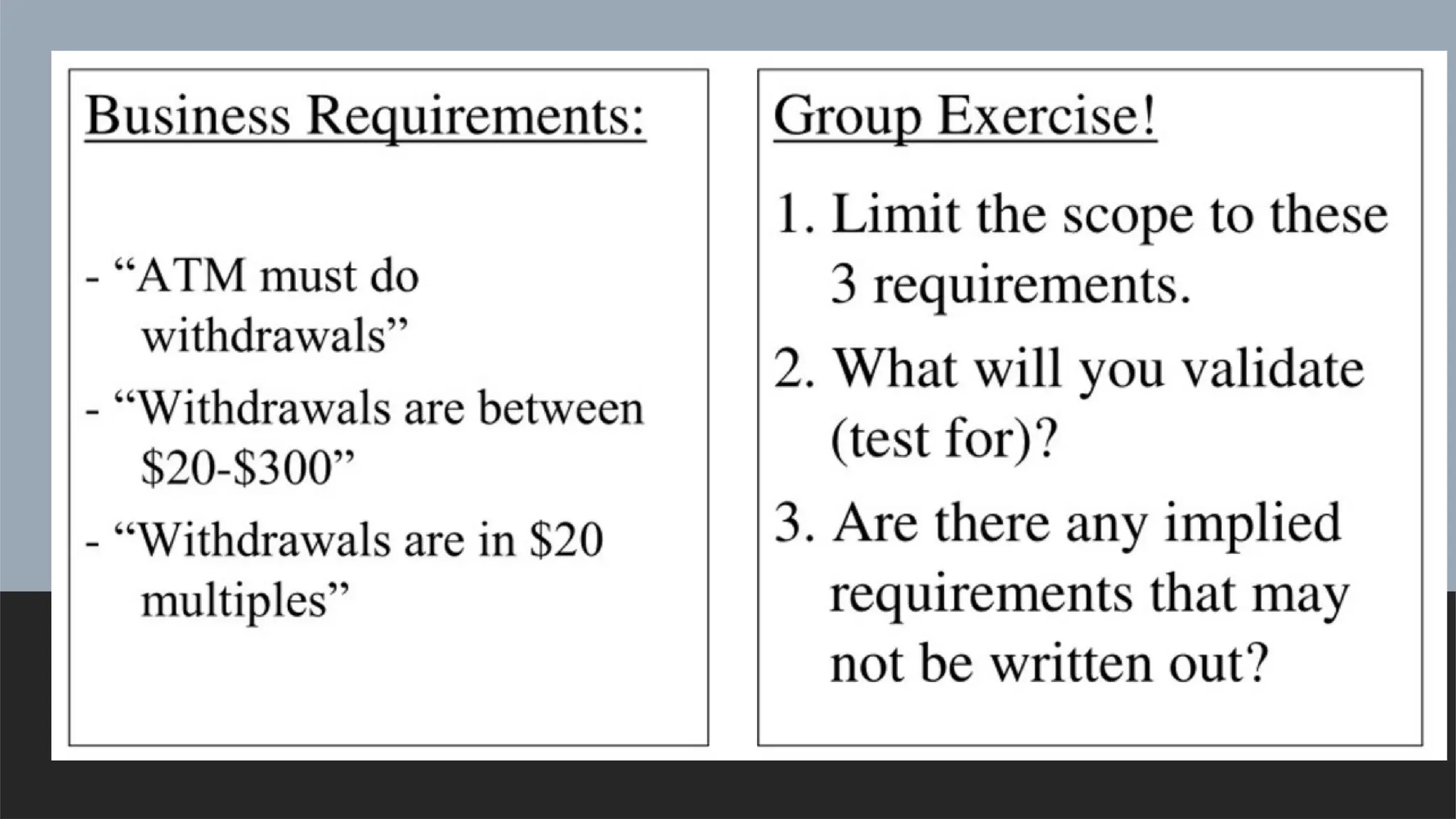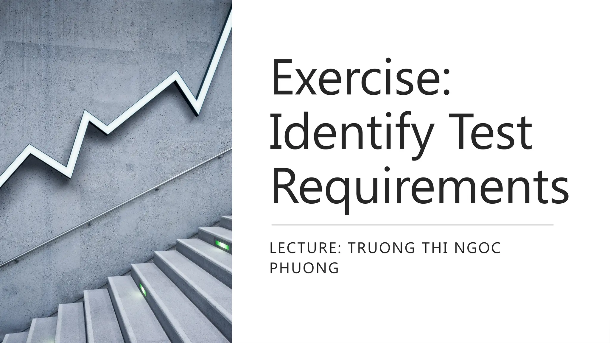 The document is a lecture by Truong Thi Ngoc Phuong focused on identifying test requirements. It outlines the instruction to write down all possible test requirements for a specified procedure. The context of the lecture is dated 18/11/2024.