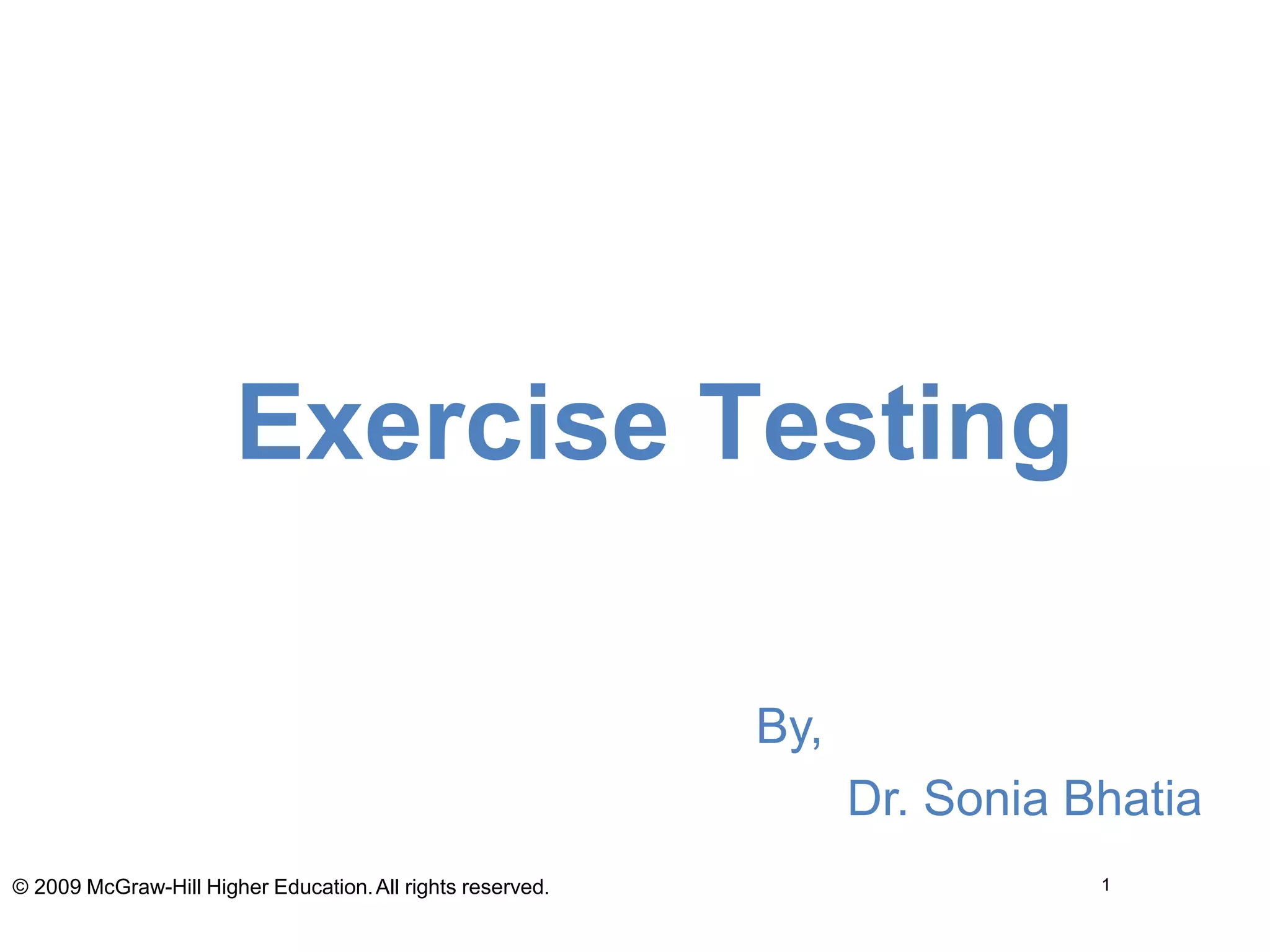 Exercise testing involves measuring an individual's physiological response to exercise in order to evaluate cardiovascular and respiratory function. There are maximal and submaximal tests, with maximal tests directly measuring VO2 max and submaximal tests estimating functional capacity. The Bruce protocol is a common maximal treadmill test that progressively increases speed and incline over stages. The six-minute walk test is a submaximal test measuring distance walked over six minutes to assess functional exercise ability.