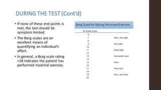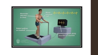 Exercise tolerance testing (ETT) is a noninvasive test that evaluates the cardiovascular system's response to exercise. It can help diagnose cardiac disease, assess prognosis, and evaluate treatment effects. The test monitors electrocardiogram, blood pressure, functional capacity, and symptoms during increasing levels of exercise. It has advantages of safety, availability, and low cost but has low sensitivity and specificity. Complications can include cardiac events, arrhythmias, and pulmonary issues.