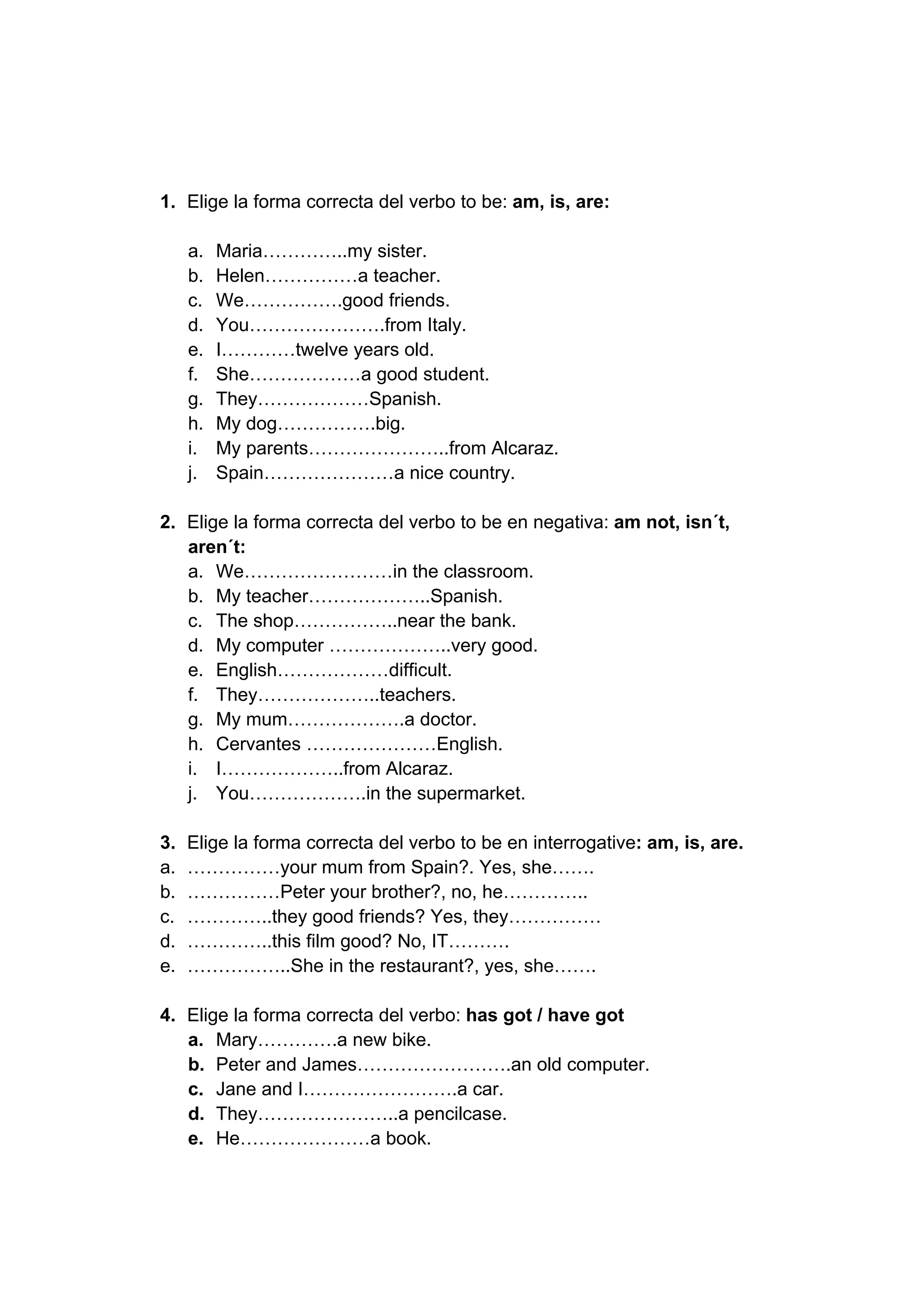 The document provides examples to practice conjugating the verbs "to be" and "have got" in English. It contains 5 sections with multiple choice questions to choose the correct form of "to be" in the affirmative, negative, and interrogative as well as the correct form of "have got". The questions cover subjects like family, possessions, location, descriptions and more to illustrate when to use "is", "are", "am", "isn't", "aren't", and the forms of "have got".