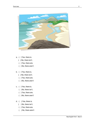 The document contains exercises from the New English Point book 2. It includes pre-unit exercises where students are asked to complete sentences, answer questions, and fill in dialogs. The exercises get progressively more difficult through the six units, covering topics like possessions, days, months, sports, daily routines, frequency of actions, food countables and uncountables. Exercises include filling in blanks, rewriting sentences, forming questions, and other language practice.