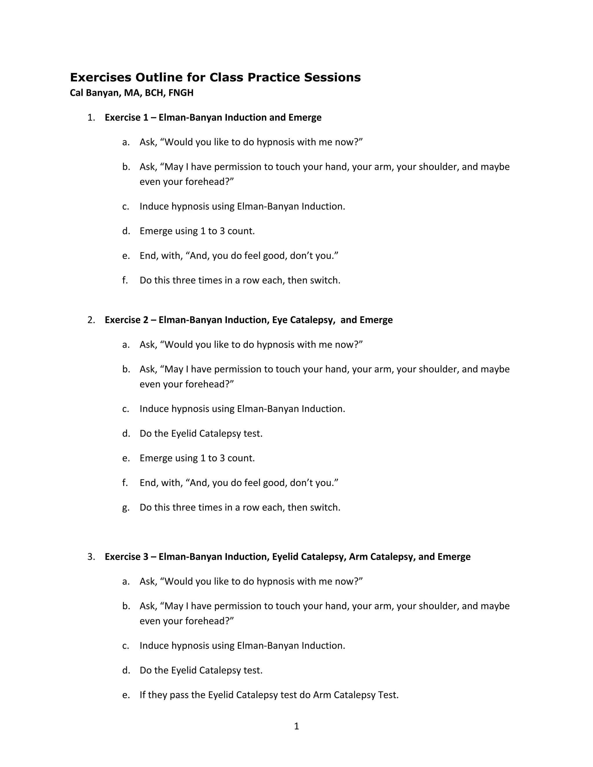 1. The exercises outline hypnotic inductions and tests to practice with a partner, including the Elman-Banyan induction, eye and arm catalepsy tests, and emerging from hypnosis using counts.