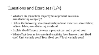 The document contains exercises related to product costs in manufacturing, including definitions and distinctions between direct and indirect costs, as well as product and period costs. It includes multiple examples and problems involving cost calculations for various companies and products, such as coffee stands and ski retailers, detailing fixed and variable costs, total costs, and unit costs. Additionally, it provides guidance on preparing traditional and contribution format income statements based on given data.