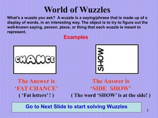 The document describes various puzzles and brain teasers, including wuzzles (phrases displayed in an interesting way to be guessed), lateral thinking puzzles, mystery object identification, math puzzles, and matchstick arithmetic puzzles. It provides clues and asks the reader to make guesses before revealing the answers on subsequent slides. The goal is to engage critical thinking skills and provide mental stimulation through solving the variety of puzzles.