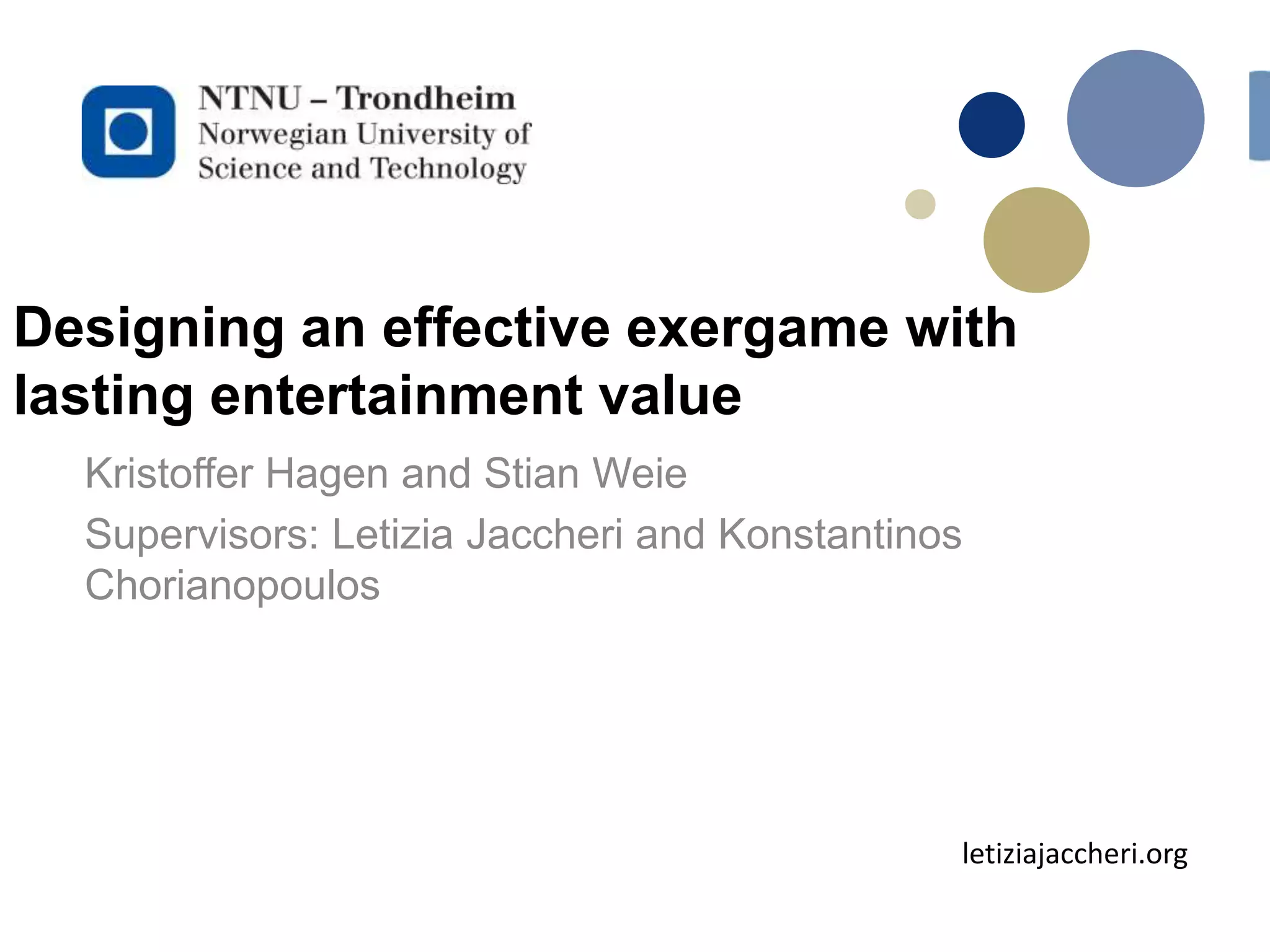 This document discusses designing effective exergames with lasting entertainment value. It first provides background on exergames and their goals of getting people active. The authors then propose developing a bike-based exergame incorporating features of popular video games. Their prototype, called "Pedal Tanks," is a cooperative multiplayer online game requiring lower body exercise. Initial reception was positive but larger studies are still needed to understand long-term adherence and health benefits once novelty fades. Future work should explore game mechanics that sustain appeal and encourage long-term behavior change.
