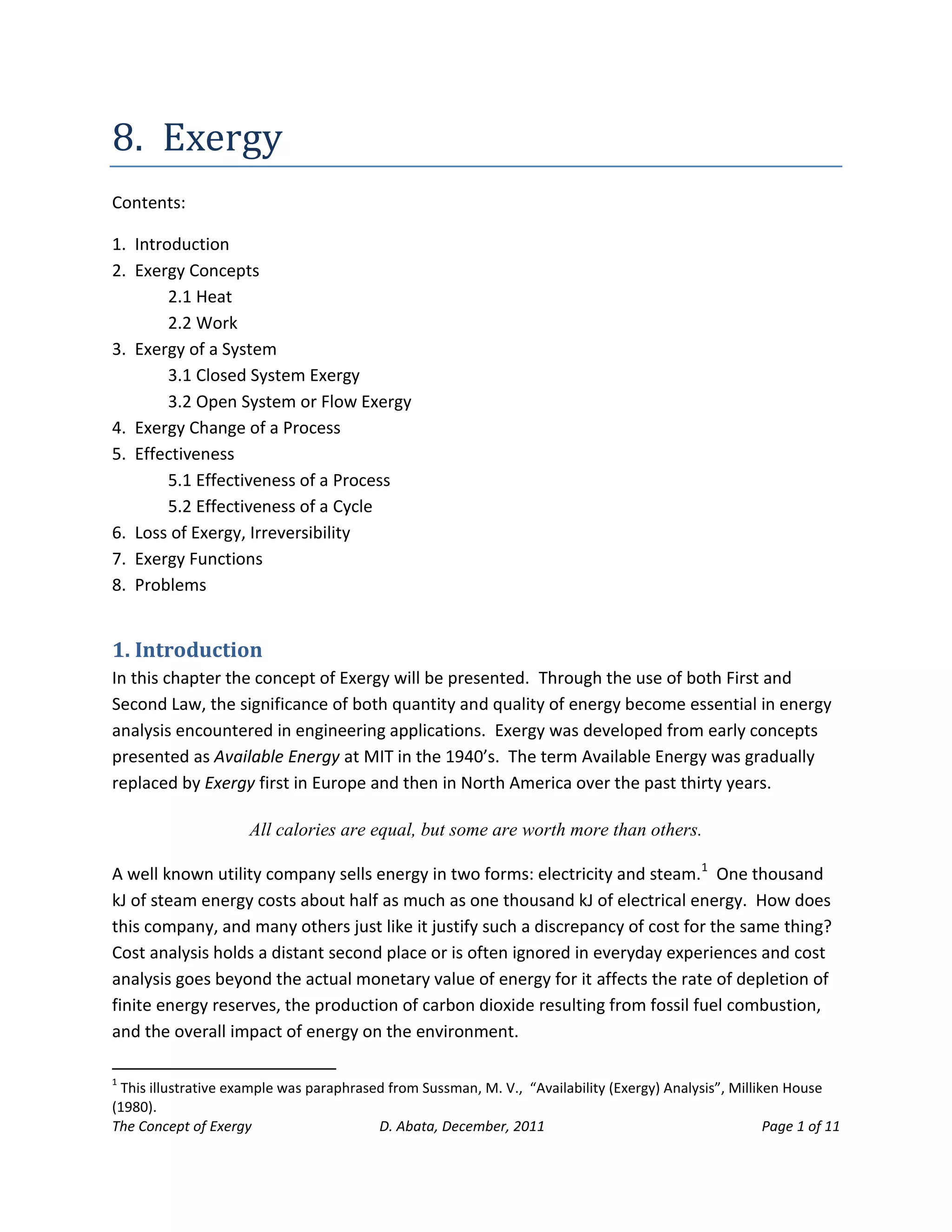 The document discusses the concept of exergy, which is a measure of the available useful work in a system or flow of matter and energy. Exergy is defined as the maximum theoretical useful work obtained as the system is brought into equilibrium with its surroundings. The document covers definitions of heat, work and exergy, as well as exergy of closed and open systems. It also discusses exergy change, effectiveness and loss of exergy due to irreversibilities. Several example problems are provided to calculate exergy values and changes for various thermodynamic processes.