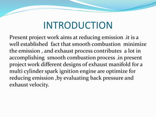 This document discusses the design and modeling of an exhaust manifold using CATIA V5 software. It aims to reduce emissions by optimizing exhaust manifold designs for a multi-cylinder spark ignition engine and evaluating back pressure and exhaust velocity. It describes the goals of performance exhaust manifolds to decrease flow resistance and increase engine volumetric efficiency. It also discusses the exhaust pulse and pressure heads during the exhaust stroke and outlines the scope for further CFD analysis, use of stainless steel, and thermal/structural analysis of different manufacturing methods.