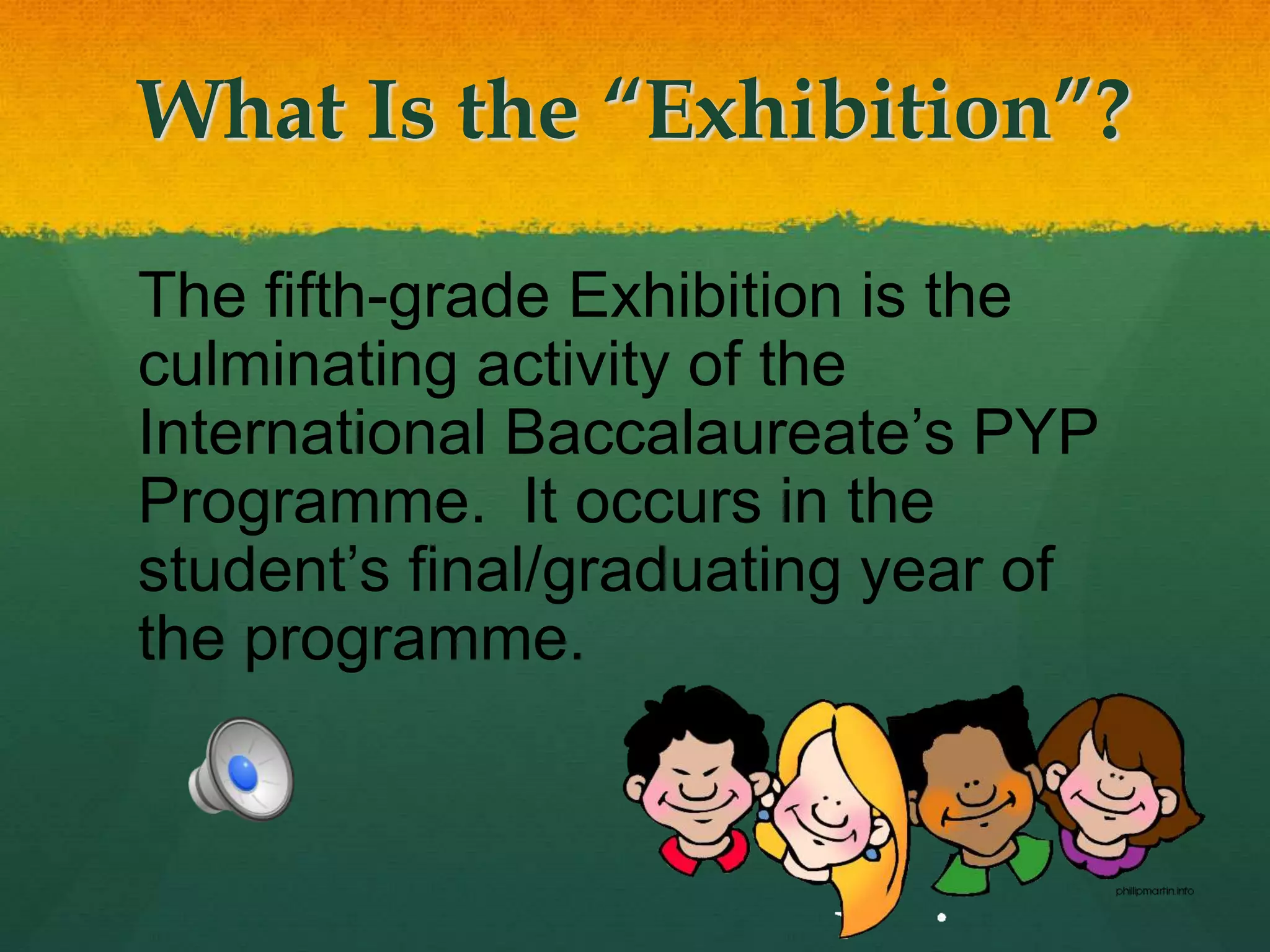 The Exhibition is the culminating project of the IB PYP program for 5th grade students. It involves students working in groups to conduct an open-ended inquiry into a real-world issue of their choosing. Over the course of 5 weeks, with guidance from mentors and teachers, students research their topic, develop their understanding of key concepts and skills, and create a final multimedia presentation to share their findings. The goal is for students to independently apply what they've learned over their PYP experience to an issue that interests them personally and globally. Progress and work is assessed using rubrics, with the focus being on the learning process rather than just the final product.