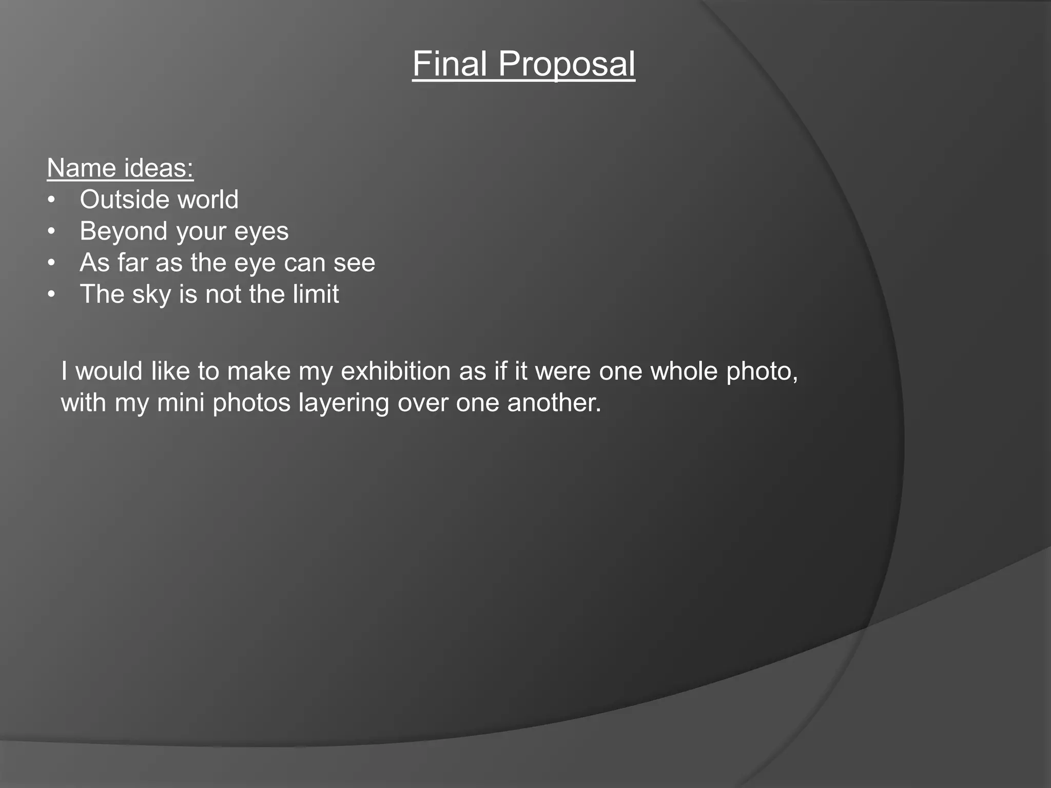 The document discusses plans for a photography exhibition on macro and landscape topics. It considers potential exhibition titles and name ideas that reference the outdoors. The proposal is to layer multiple miniature photos on top of one another to create a single composite image. Photos will be taken around the student's school and in rural countryside areas, inspired by amazing internet photos. Costs of a camera, tripod, SD cards and possible photo editing in Photoshop are listed. The exhibition may be displayed in a frame rather than on cards.