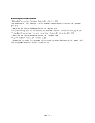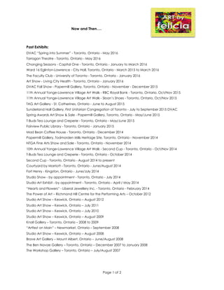 This document lists the past exhibits and charitable fundraising events of an artist over the past decade. It details over 50 past exhibits of the artist's work in various galleries, libraries, and other venues in Ontario from 2014 back to 2007. It also lists 9 charitable fundraising events from 2016 to 2012 where the artist donated artwork to be auctioned off, raising money for organizations like Gilda's Club and cardiac health charities.