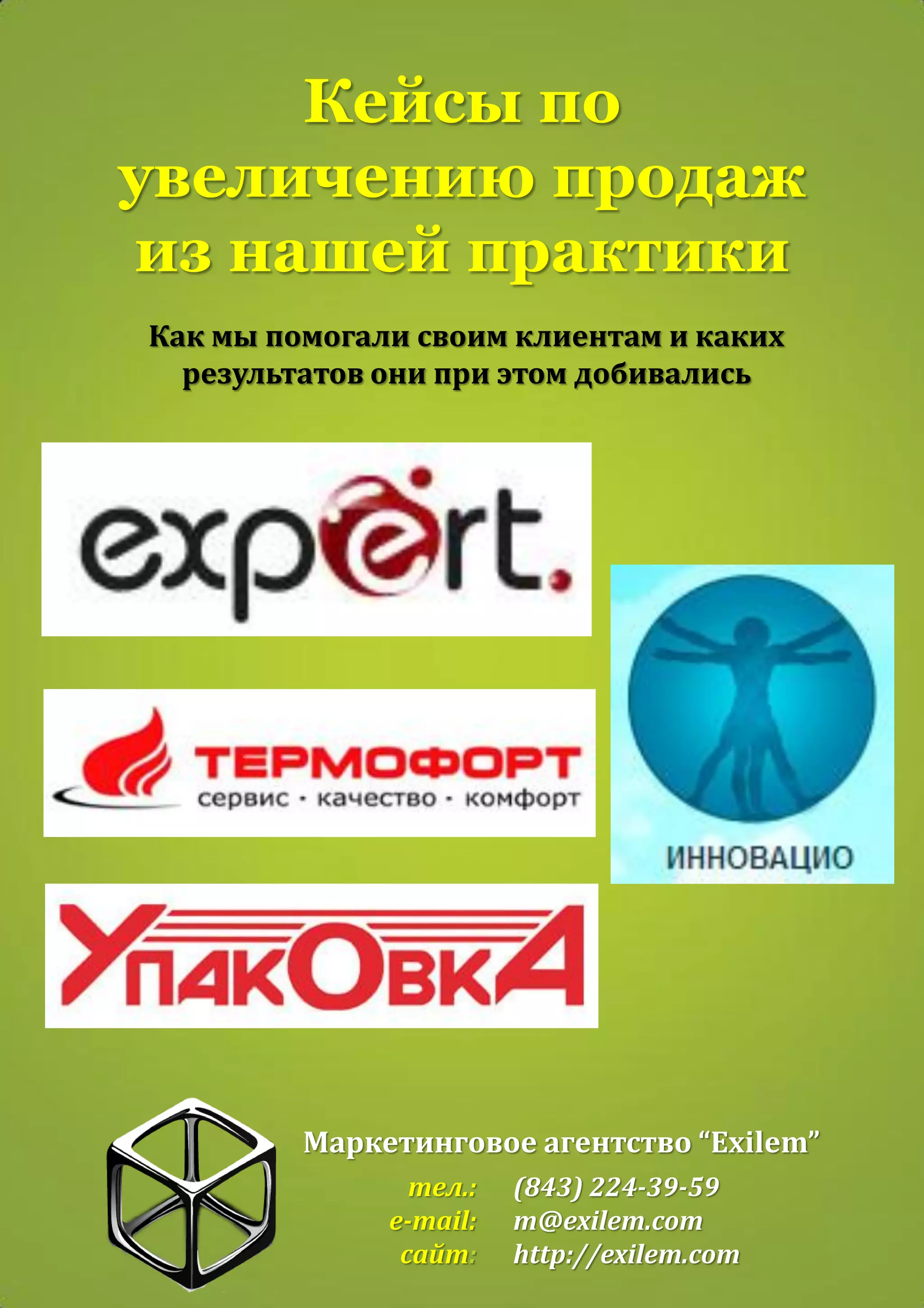Документ описывает успешные кейсы по увеличению продаж, реализованные маркетинговым агентством 'exilem' для различных компаний. В каждом случае применялись специальные стратегии, такие как пересмотр тарифной политики, проведение маркетингового аудита и внедрение новых бизнес-процессов, что позволило достичь заметного роста продаж и улучшения клиентского обслуживания. В конечном итоге, компании смогли увеличить свою долю рынка и улучшить финансовые показатели.