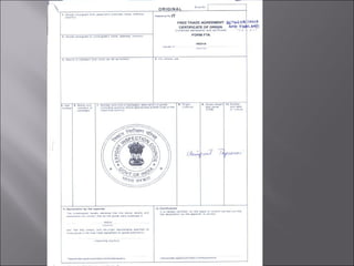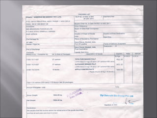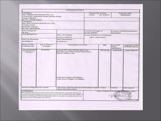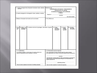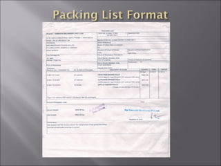 The document outlines the key steps involved in the export process in India, including obtaining necessary licenses and certificates, finding overseas buyers, confirming export orders, packaging and marking goods, pre-shipment inspection, customs clearance, shipping goods, and realizing export proceeds. It discusses procedures such as applying for an IEC number, obtaining certificates of origin, clearing goods for export, loading containers, issuing bills of lading, and using a bank collection process to receive payment.