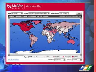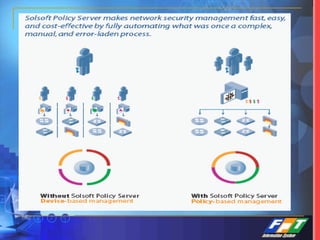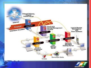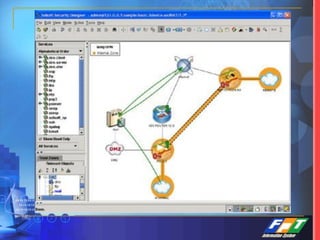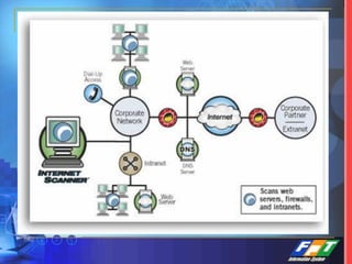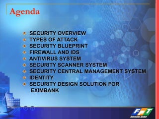 This document discusses network security solutions for Eximbank. It begins with an overview of network security and the need for an integrated defense-in-depth approach using firewalls, intrusion detection systems, antivirus software, vulnerability scanners, and centralized management. It then outlines types of attacks and provides a security blueprint. Specific solutions discussed include the Cisco PIX firewall, CheckPoint firewall, intrusion detection systems, antivirus systems, vulnerability scanners, and identity and policy management solutions. The document concludes with an overview of the proposed security design for Eximbank incorporating these various solutions.
