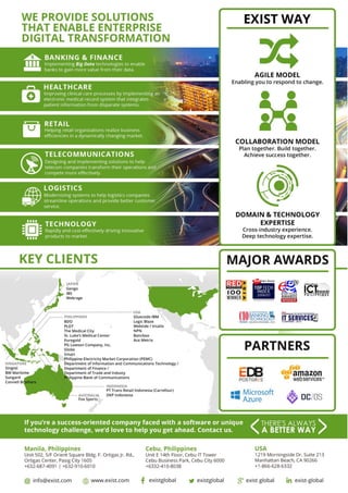 Exist is a global technology innovator providing enterprise solutions through consulting and innovative products and services. With a comprehensive portfolio of integrated Information Technology solutions and services, we empower enterprises to transform and build sustainable advantage. Backed by more than a decade of innovation, Exist leverages on its team’s expertise in Open Source technologies, domain expertise, knowledge in business processes and agile methodology to build better technology software for both technology companies and the enterprise. We are one of the early adopters of Java Open Source Software, which has become the core technology when building scalable, robust and highly customizable software application. Exist’s technology solutions and services span clients in Asia Pacific, Australia and the US from a diverse range of verticals including Retail, Banking and Finance, Healthcare, and other industries.