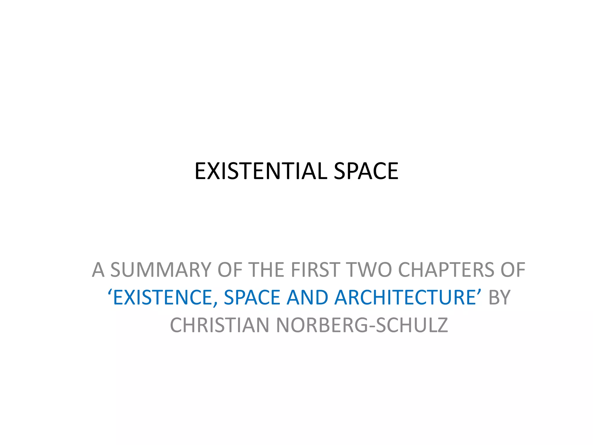 The document explores the concept of existential space as defined by Christian Norberg-Schulz, highlighting how human perception of space is influenced by cognitive and emotional experiences related to one's environment. It discusses various philosophical theories of space, the relationship between architecture and existential experiences, and how space is perceived through individual motivations and past experiences. The summary concludes by emphasizing the importance of understanding spatial interaction and the development of existential space in contemporary society.
