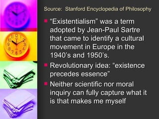 Existentialism is a philosophical movement that emphasizes individual existence, freedom and choice. Some key ideas include: (1) existence precedes essence, meaning humans define their own essence through their actions rather than having a predetermined essence; (2) authenticity refers to living in accordance with your freely made choices rather than what others expect; (3) anxiety arises from realizing one's freedom and responsibility to define oneself. Existentialism influenced many artists and writers in the mid-20th century.