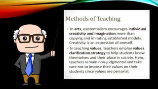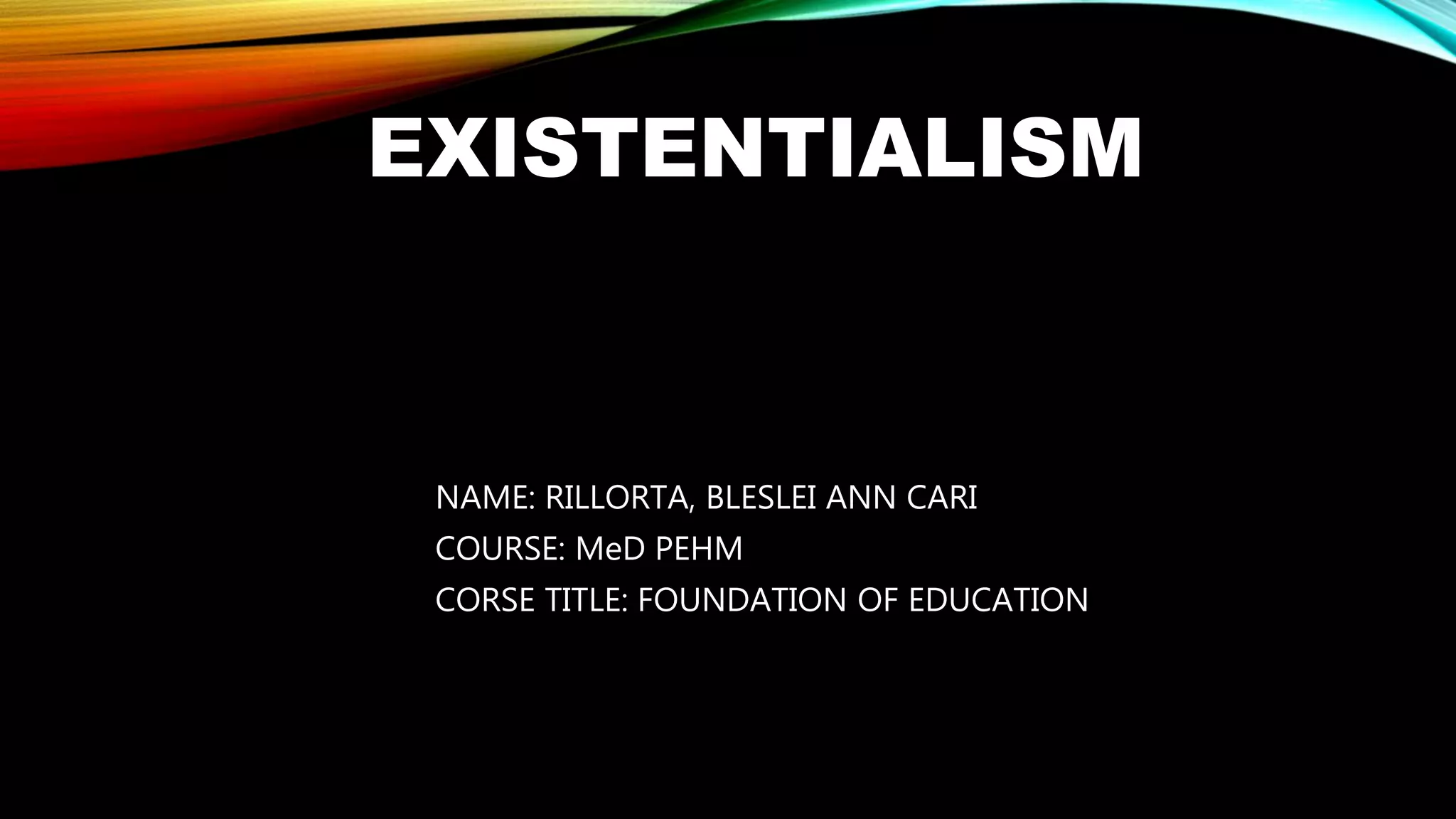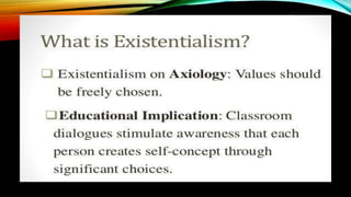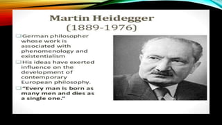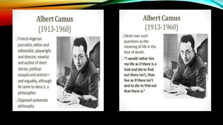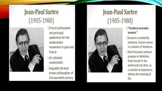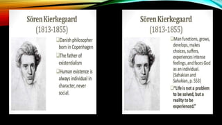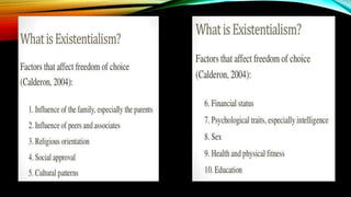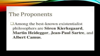 Existentialism is a philosophy concerned with finding meaning and purpose through free will and personal responsibility. It believes that people search for their identity and meaning as they make choices which shape who they are. A key concept is that existence precedes essence, meaning people define themselves through their actions rather than having a predetermined essence.