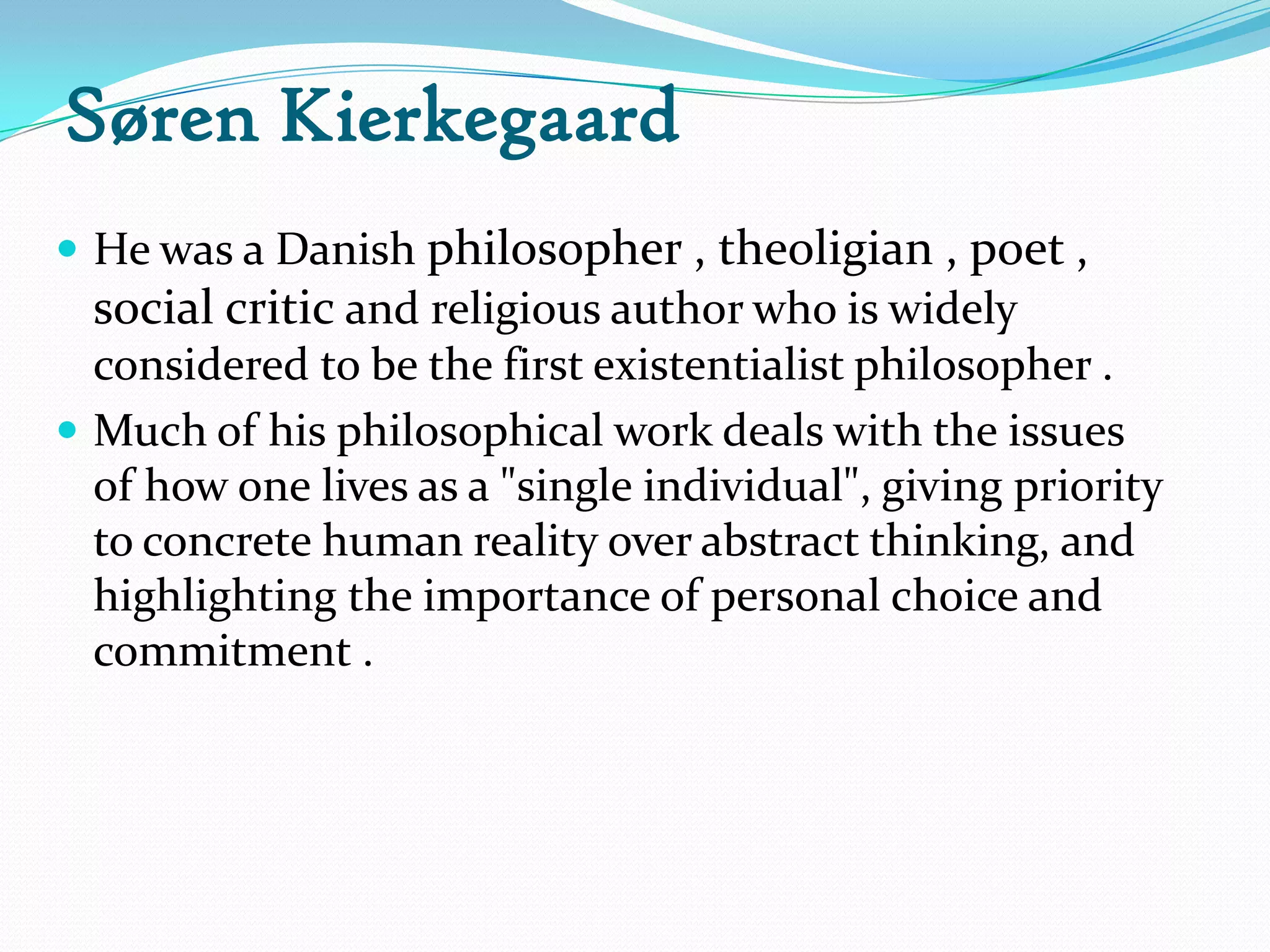 - Søren Kierkegaard focused on individual existence, faith, and choice over abstract thinking. Jean-Paul Sartre believed humans are "condemned to be free" without a creator or essence. Friedrich Nietzsche spoke of the "death of God" and the dissolution of religion and metaphysics.
