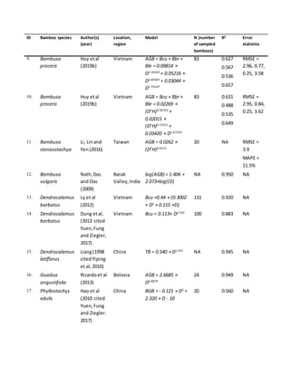 This document presents 24 existing allometric equations for estimating aboveground biomass (AGB) or its components in different bamboo species. The equations were developed by various authors in locations across Asia and South America. For each equation, the document provides the bamboo species, authors and year, location, the regression model, number of sampled bamboos, coefficient of determination (R2), and any error statistics. The equations relate AGB or its components to measures of bamboo diameter (D) and sometimes height (H).