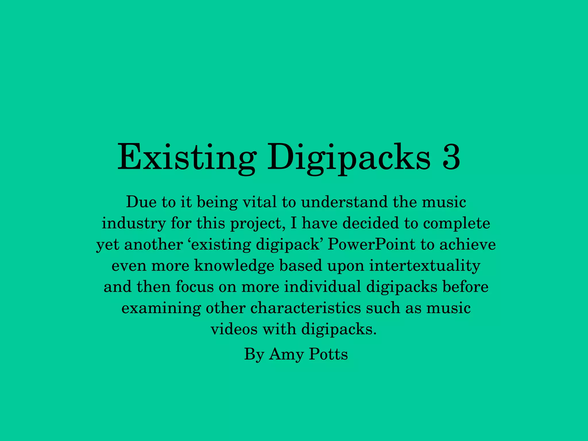 This document analyzes and summarizes the key characteristics of several music artists' album covers in a digipack format. It discusses elements like consistent fonts, photography style, color schemes, depiction of the artist, and use of settings or backgrounds that relate to the music's themes or lyrics. Overall, the document examines how these covers establish recognizable styles for each artist while also creating intertextuality between their different albums through similar visual elements.
