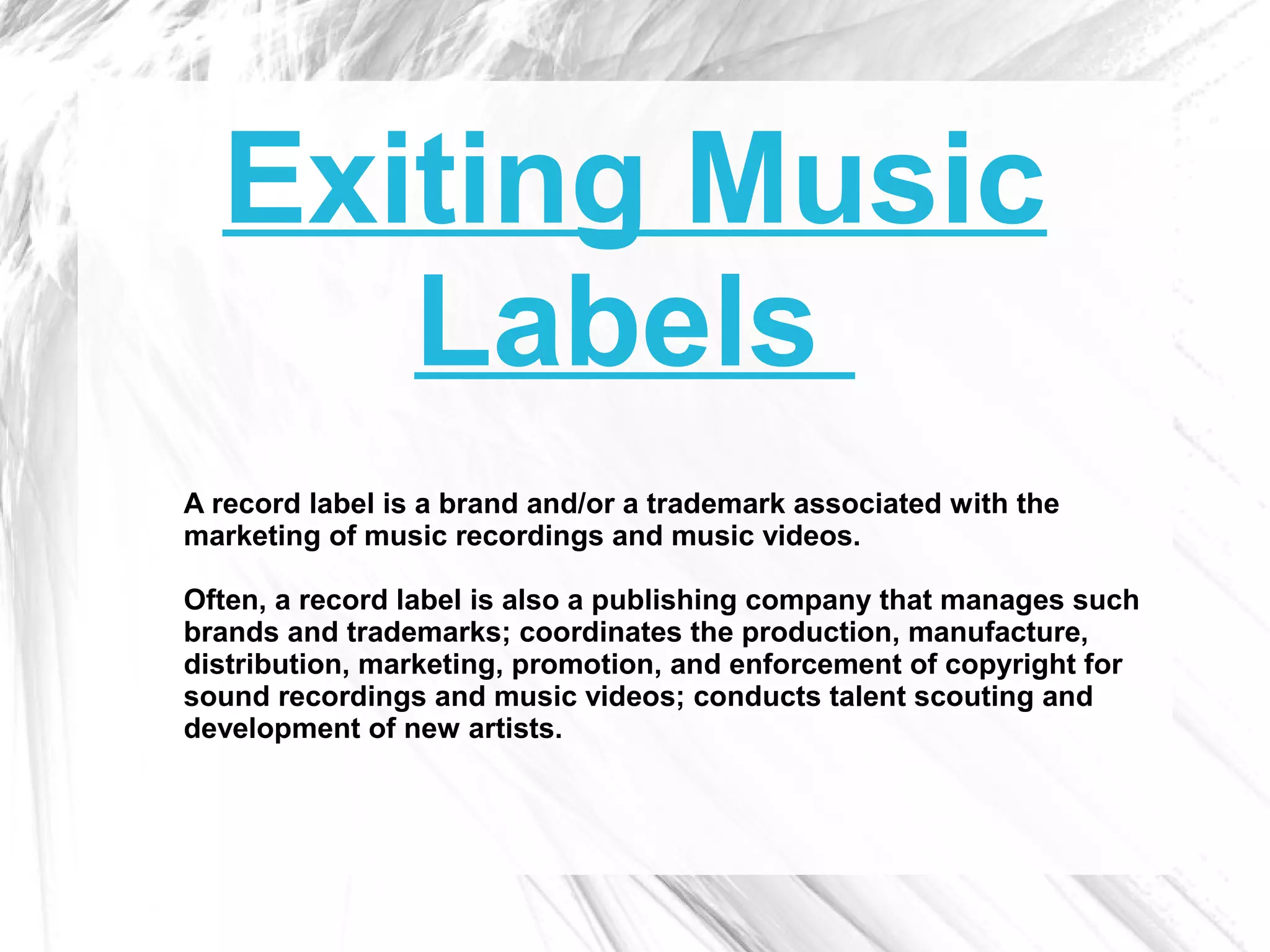 The document discusses record labels and provides examples of major and independent labels. Major labels include Warner Music Group, Columbia Records, and Sony Music Entertainment. Warner Music Group is one of the big four record companies based in New York City. Columbia Records was founded in 1888 and was the first company to produce pre-recorded records. Independent labels are not controlled by the big three major labels and examples given are any label not mainstream as well as Boy Better Know, a UK collective founded in 2005.