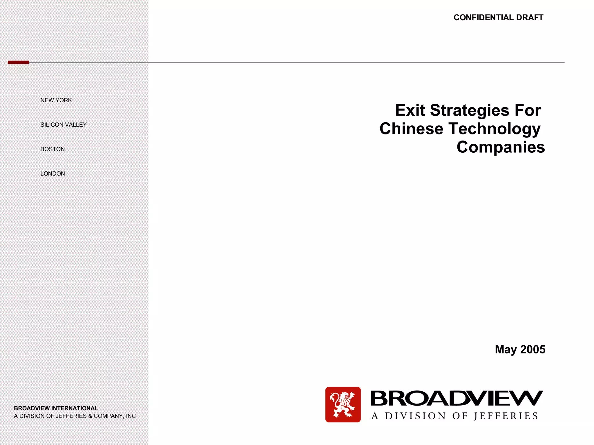 This document discusses exit strategies for Chinese technology companies. It provides an overview of the IPO and M&A markets and trends in the US and China. While Chinese companies typically pursue listings in Hong Kong, dual listings, or other exchanges, historically many Chinese tech companies pursued sole listings on the NASDAQ. In 2004, the mix of IPO and M&A exits for Chinese firms returned to 2000 levels, with about half of Chinese tech companies that went public choosing sole NASDAQ listings.