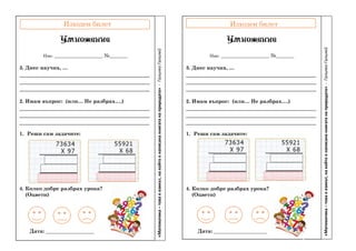 Документ представляет собой выходной билет по математике, в котором учащиеся должны записать, что они изучили, задать вопросы и решить задачи самостоятельно. Также включены вопросы для самоконтроля понимания урока. Цитата Галилео Галилея о математике подчеркивает её значимость в описании природы.