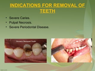 This document discusses exodontia, or tooth extraction. It outlines indications for tooth removal such as caries, necrosis, and periodontal disease. Contraindications include certain systemic conditions and medications as well as local conditions like osteoradionecrosis. The clinical and radiographic evaluation of teeth planned for extraction is described. Anatomical factors like root morphology and bone thickness that influence forceps movement are covered. Finally, the basic techniques and steps of closed tooth extraction using dental forceps are explained in detail.