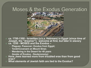 This document provides an overview of the pre-historic period through the time of Moses and the Exodus according to the biblical narrative. It discusses debates around the factual historicity of Genesis 1-11 and key events and time periods described in the books of Exodus through Deuteronomy, like the Israelites' enslavement in Egypt, the Exodus led by Moses, and the Israelites' 40 years of wandering in the desert. It also includes brief summaries and maps related to the route and chronology of the Exodus and wandering.