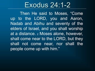 The document provides instructions from God to Moses on Mount Sinai for building the Tabernacle and establishing worship. It describes the construction of the ark of the covenant, altar, lampstand, curtains, priestly garments including the breastpiece and turban, and altar of incense. Moses was given two stone tablets with the Ten Commandments written on them by the finger of God. The purpose was for God to dwell among the Israelites and for Moses to teach them God's laws and commands.
