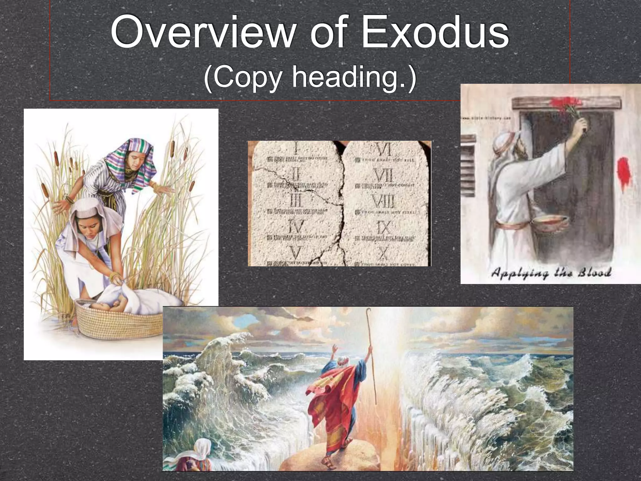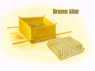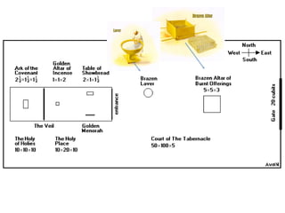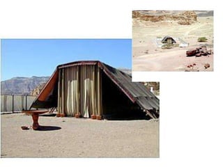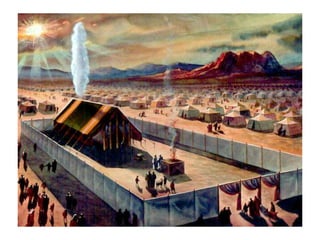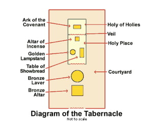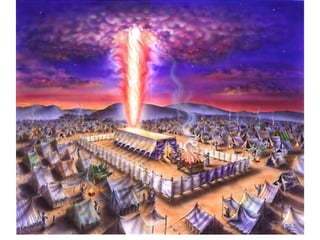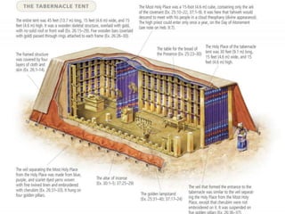 The document provides an overview of key passages in Exodus, including God revealing himself as "I am the LORD" and bringing the Israelites to the promised land. It also outlines the major sections of Exodus and reviews Moses' life. The plagues against Egypt are discussed, as well as the purpose and symbolism of the tabernacle.