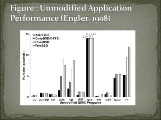 The document discusses the concept and advantages of an exokernel operating system, which allows applications to manage low-level physical resources directly, leading to enhanced performance and flexibility compared to traditional operating systems. It outlines the design principles behind exokernels, such as resource multiplexing, secure bindings, and user-level fault handling, as well as the ongoing research and development efforts at MIT. Additionally, the document addresses both the benefits and challenges of implementing exokernels, particularly in terms of balancing power and protection for applications.