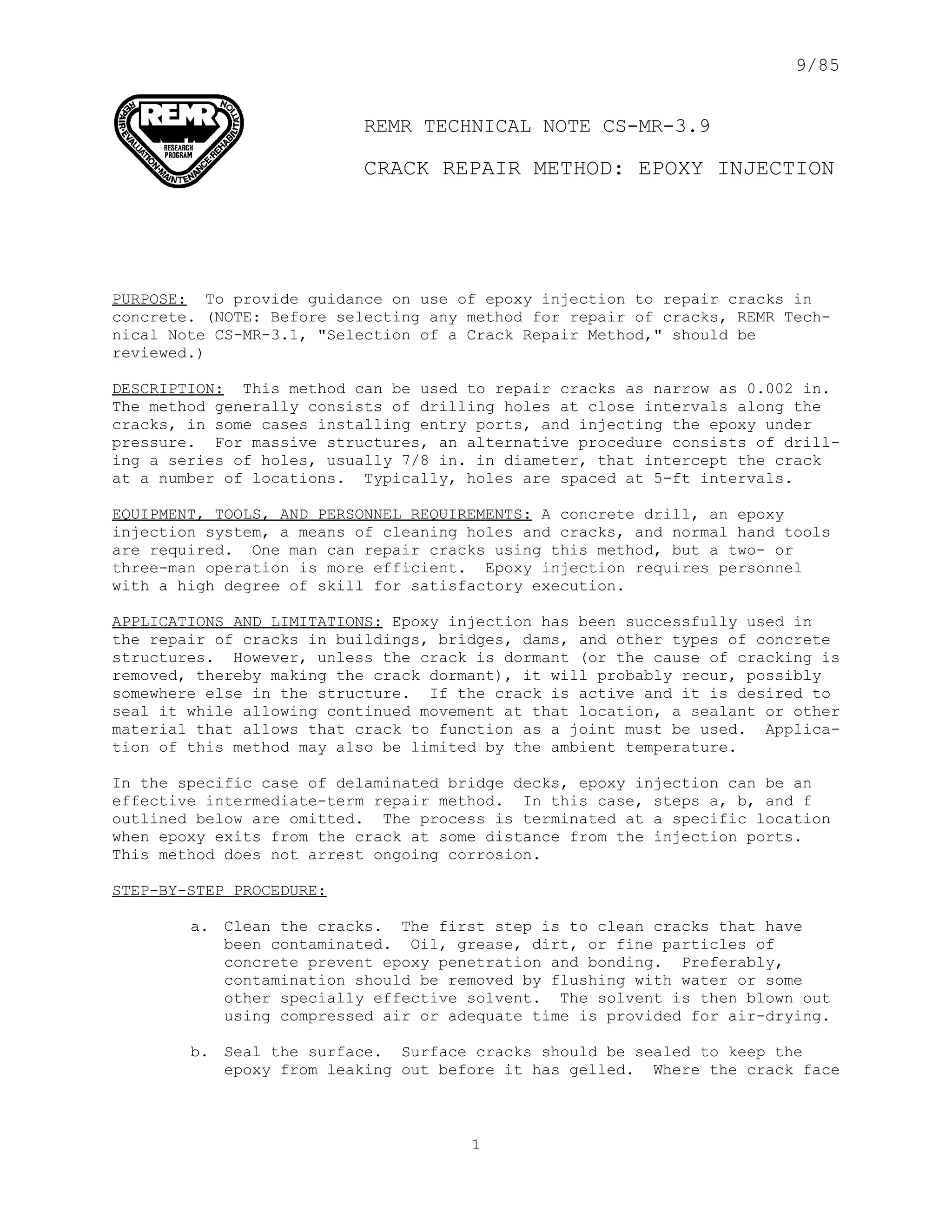 This document provides guidance on using epoxy injection to repair cracks in concrete structures. The method involves drilling holes along cracks, injecting epoxy under pressure, and allowing it to seep into the cracks. It can repair cracks as small as 0.002 inches. Epoxy injection requires skilled workers and specialized equipment. While it can effectively repair cracks temporarily, the underlying issues causing the cracks may remain if not addressed.