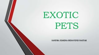 This document provides information on various exotic pets including sugar gliders, hedgehogs, fennec foxes, wallaroos, capybaras, sloths, spotted genets, servals, pygmy goats, and kinkajous. It describes their characteristics such as size, temperament, care needs, and longevity. Examples given are that sugar gliders are social, hedgehogs are low maintenance, fennec foxes can be litter trained, wallaroos can jump 6 feet, capybaras are the world's largest rodents, sloths spend most of their time sleeping, genets have cat-like features, servals can weigh up to 50 pounds and are noct