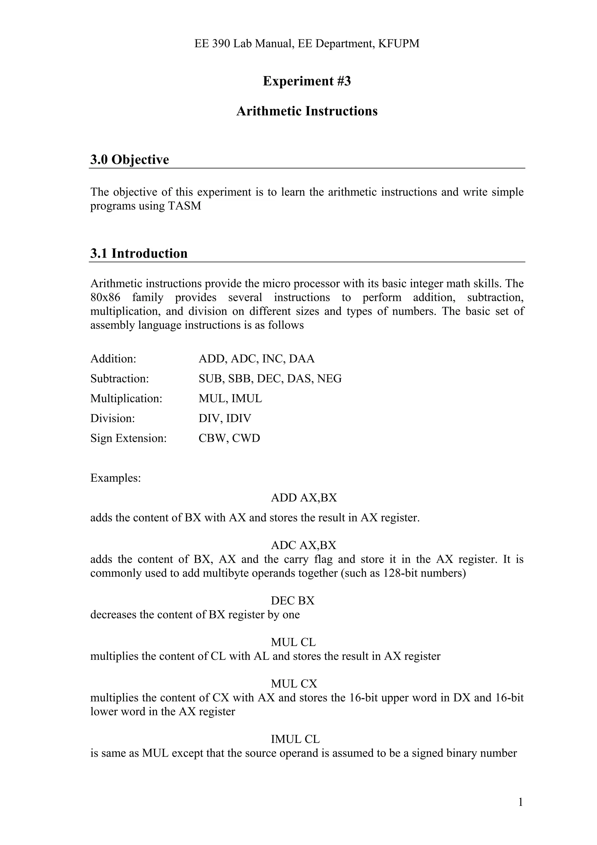 This document contains instructions for Experiment #3 of an EE lab manual. It discusses arithmetic instructions in assembly language such as addition, subtraction, multiplication, and division. It provides examples of using these instructions and defines pre-lab and lab exercises involving writing assembly programs to perform arithmetic operations on numbers stored in memory locations. Students are asked to write programs that add and multiply numbers, convert letters between cases, calculate an average of input numbers, calculate a factorial, and modify existing programs.