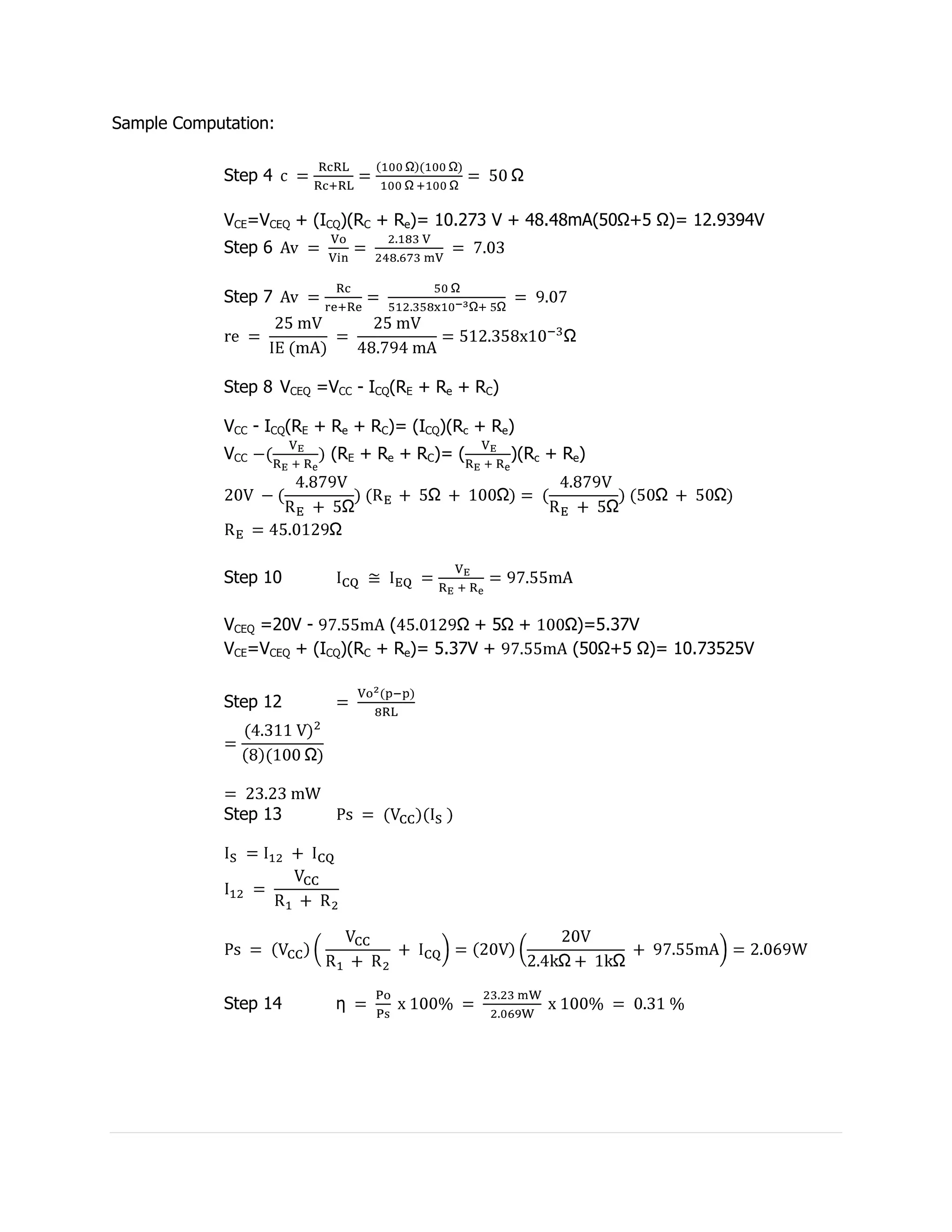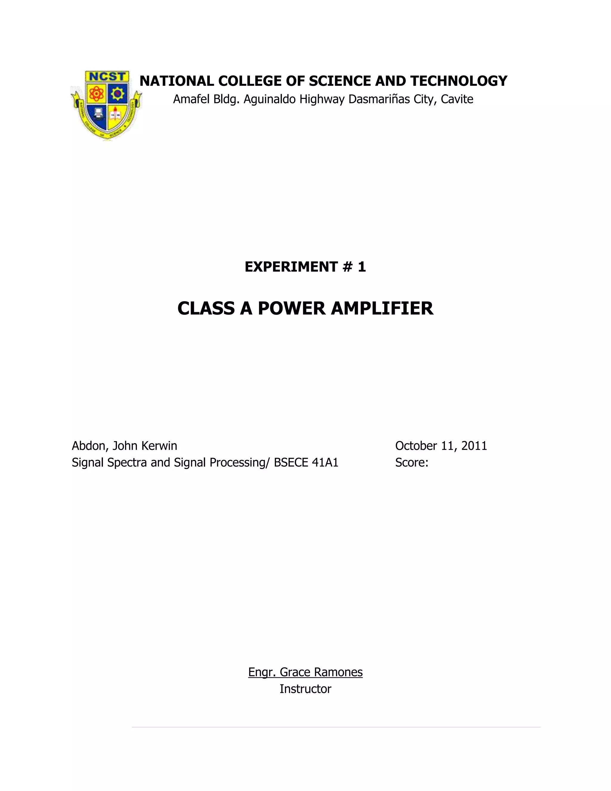 The document describes Experiment #1 on a class A power amplifier. Key points: