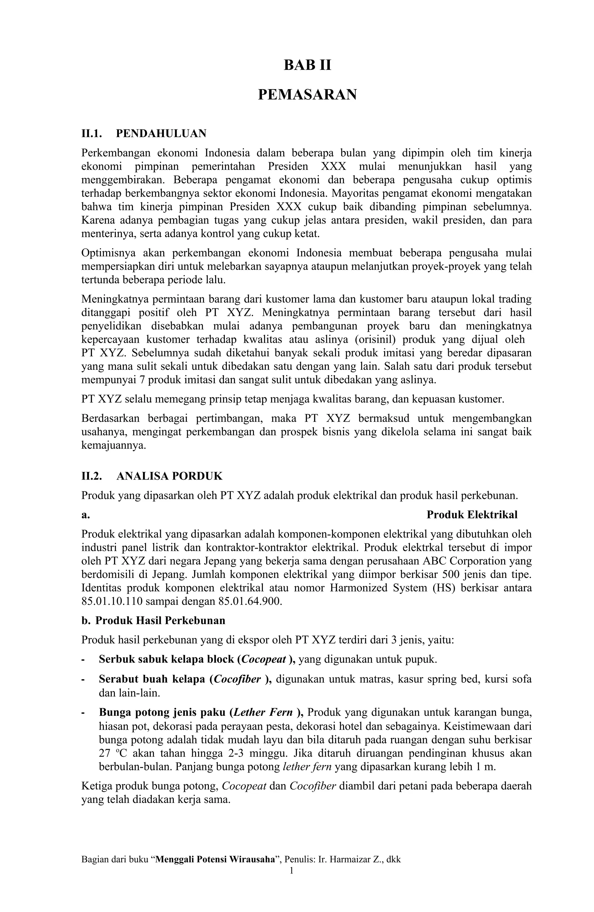 Dokumen ini membahas tentang perkembangan positif ekonomi Indonesia di bawah kepemimpinan presiden xxx dan optimisme pelaku usaha dalam memperluas bisnis, khususnya PT XYZ yang bergerak di bidang produk elektrikal dan produk hasil perkebunan. PT XYZ berencana untuk meningkatkan produksi dan memperluas pasar, khususnya untuk produk bunga potong leather fern, sambil menjaga kualitas dan kepuasan pelanggan. Selain itu, PT XYZ juga menggunakan strategi pemasaran yang melibatkan kerja sama dengan perusahaan Jepang untuk meningkatkan efisiensi dan mengatasi masalah kompetitor.
