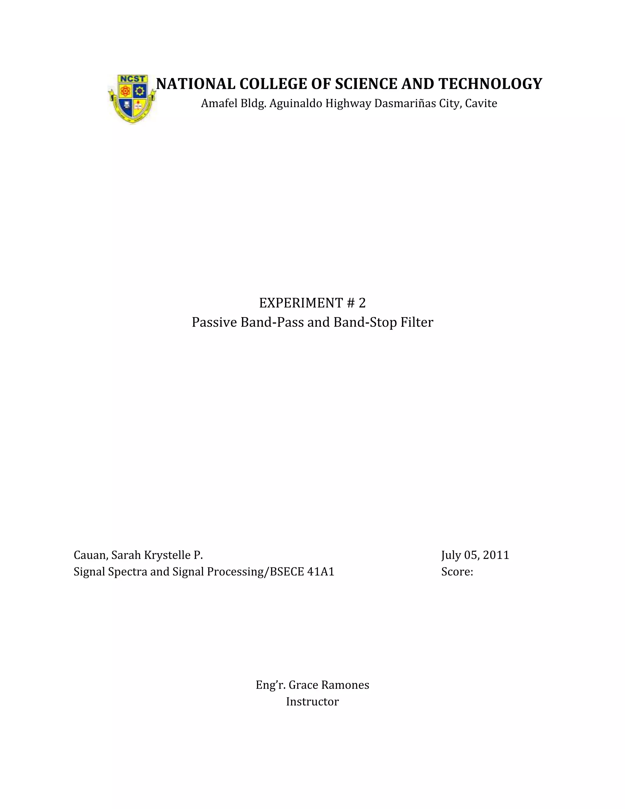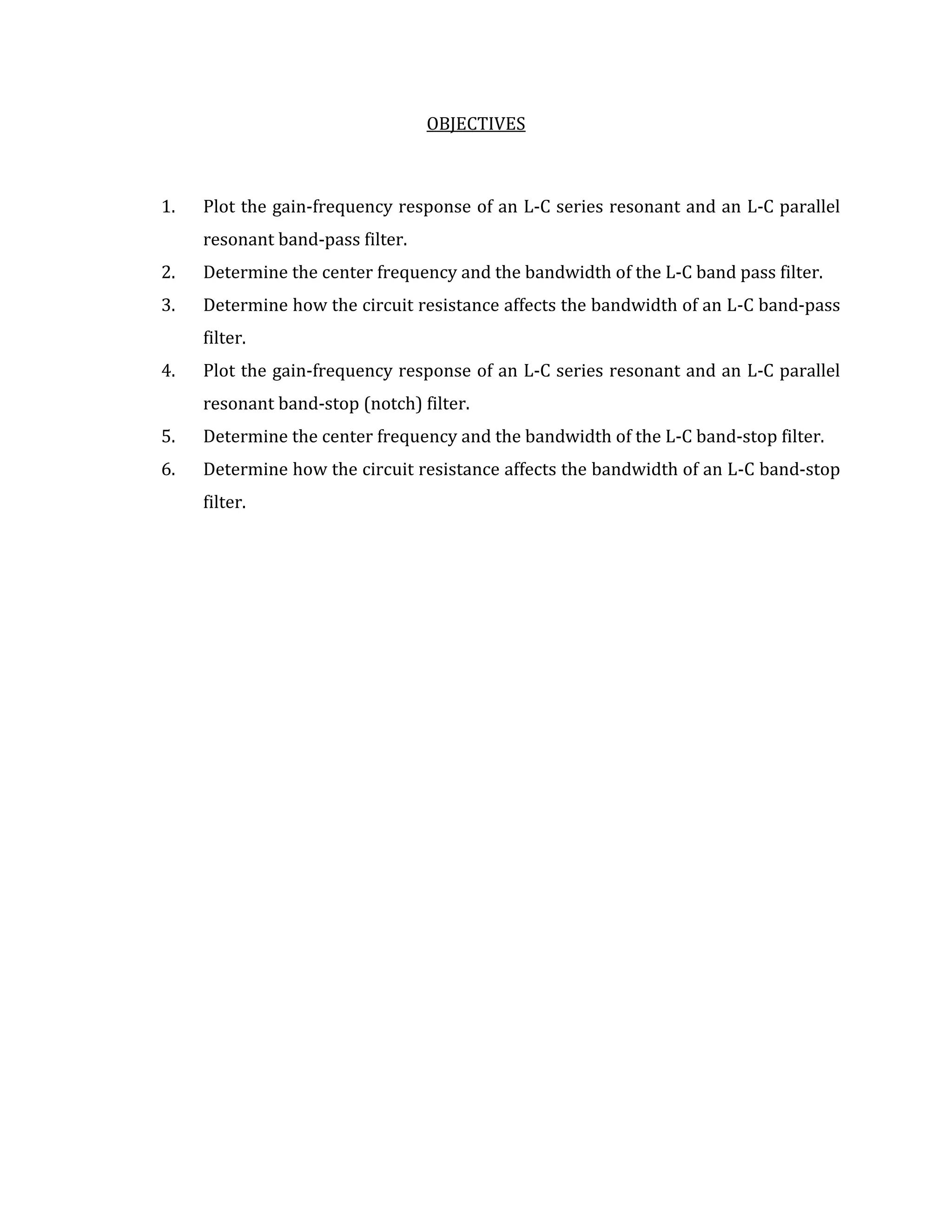 1. Objectives to plot gain-frequency responses of passive band-pass and band-stop filters, determine their center frequencies and bandwidths, and how circuit resistance affects bandwidth.