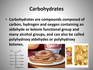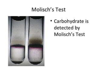 Carbohydrates are organic compounds made of carbon, hydrogen, and oxygen that serve important roles in living systems. They are divided into monosaccharides, disaccharides, and polysaccharides based on their structure. The Molisch test is a general and sensitive test used to detect the presence of all carbohydrates using concentrated sulfuric acid and alpha-naphthol to produce a purple color.
