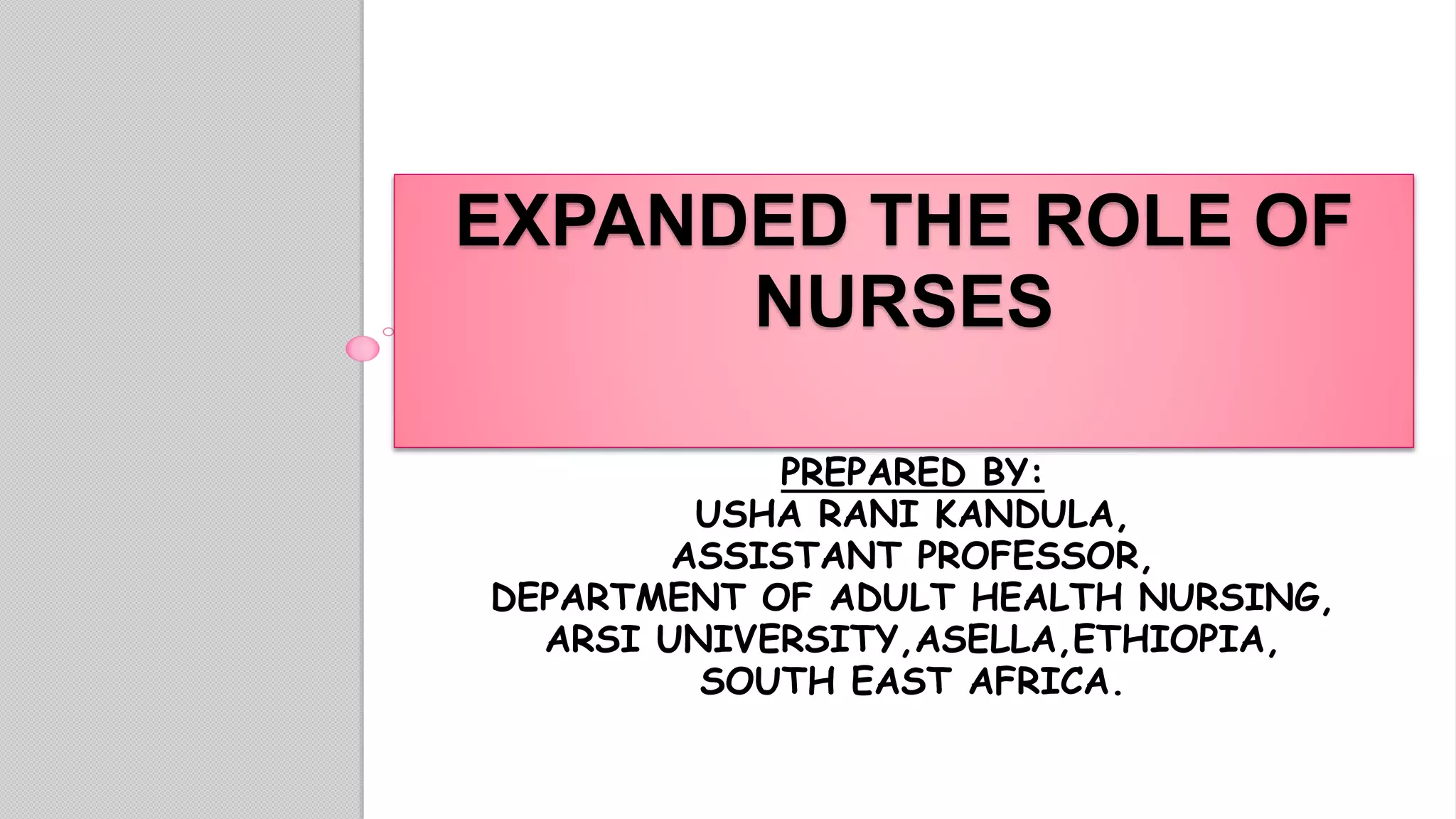 This document discusses the expanded roles of nurses. It outlines 9 roles nurses play as caregivers, communicators, teachers, counselors, decision makers, leaders/managers, comforters, rehabilitators, and protectors/advocates. It also describes 7 career roles for nurses including clinical nurse specialists, nurse practitioners, nurse midwives, nurse anesthetists, nurse administrators, nurse educators, and nurse researchers. Finally, it lists 10 qualities needed for nursing in the future, such as participating in organizations, giving expert care, working for national welfare, and having dedication to service.