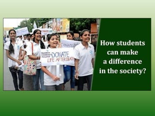 The document discusses the importance of expanding one's contributions in various roles, emphasizing that students can positively impact their lives and communities through small efforts, such as volunteering and encouraging education. It outlines different ways to contribute, including charity work, local awareness programs, and joining experienced activists to promote social responsibility. Ultimately, the document suggests that if everyone undertakes social responsibilities, it can lead to significant positive changes in society.