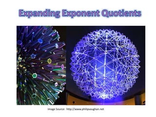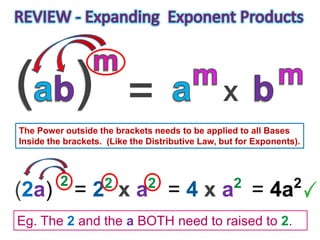 1) The document explains the expanding quotients rule for exponents, which involves applying the power outside of brackets to each term inside the brackets.
