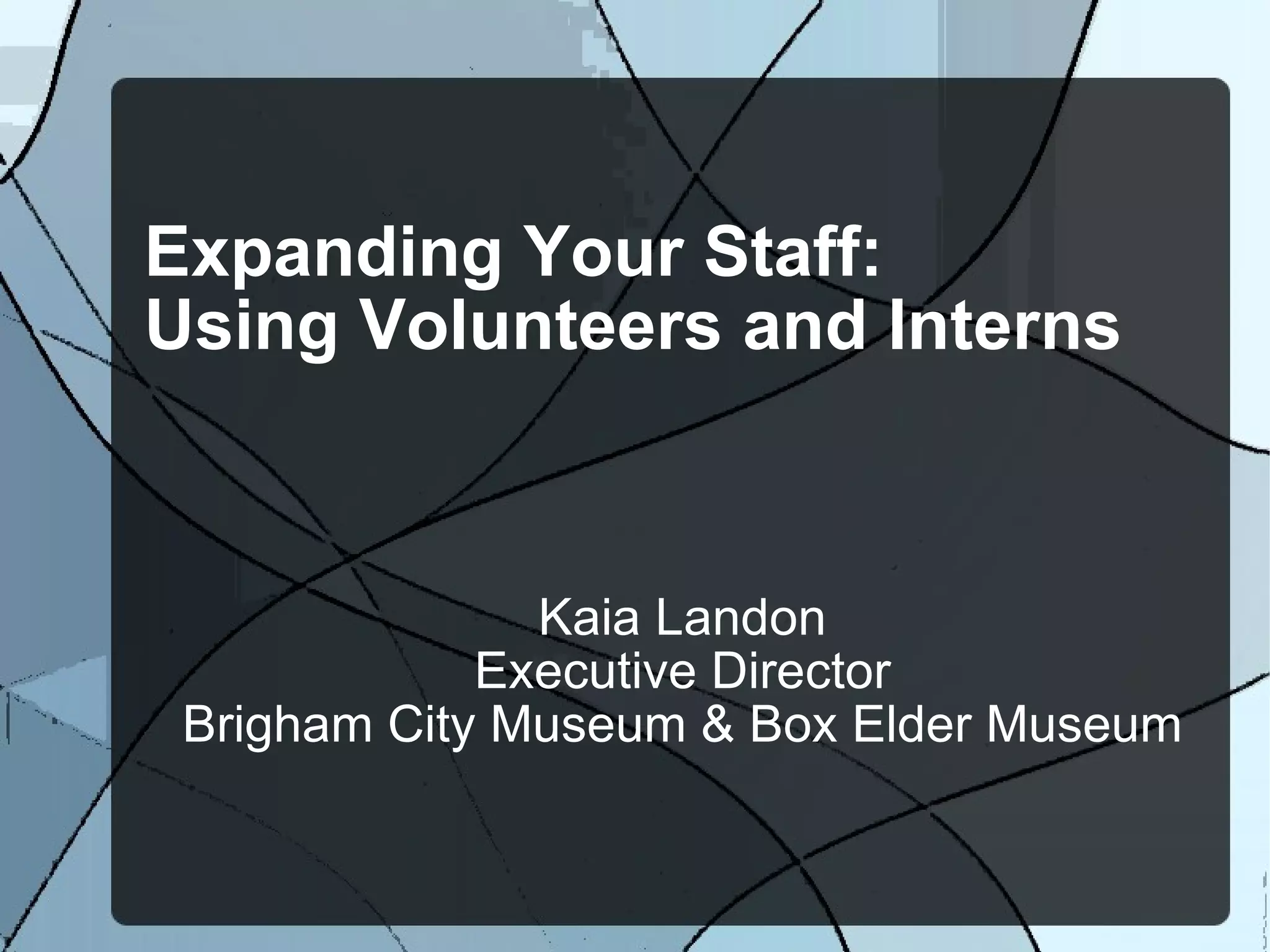 The document discusses strategies for using volunteers and interns to expand staff at museums and cultural institutions. It outlines the benefits of volunteering, legal requirements for unpaid internships, policies to consider when managing volunteers and interns, and ways to recruit, train, recognize, and manage volunteer programs.