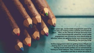 This document discusses how social media engagement has become more demanding over time as attention spans decrease and new platforms emerge. It notes that online engagement rates are lower as people share less on top platforms. The document then discusses how the company exists to help brands stand for something by defining their purpose and creating emotional campaigns. It provides examples of the company's services and award-winning campaigns for clients in various industries.