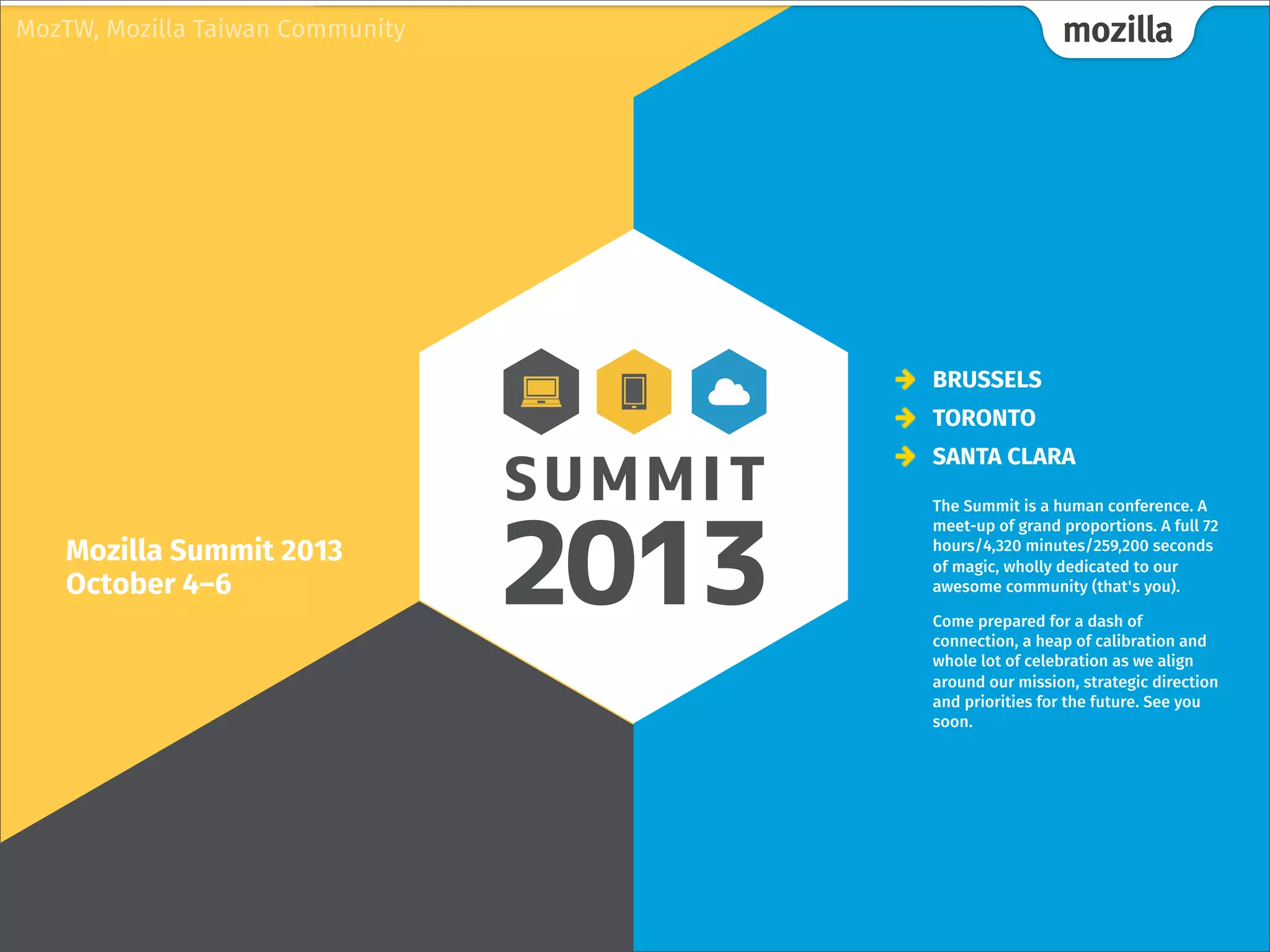 The document provides information about the Mozilla Summit 2013 which will take place from October 4-6 in Brussels, Toronto, and Santa Clara. It discusses that the summit is a 72 hour conference dedicated to connecting the Mozilla community around their mission and strategic priorities. It encourages attendees to participate in keynotes, sessions, and interactive fairs focused on understanding Mozilla's values and product strategy. Tips are provided on how to have a great experience at the summit by embracing new ideas, finding interesting sessions, being respectful of others, and having fun through connecting with others and celebrating their accomplishments.