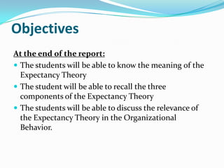 This document provides an overview of Expectancy Theory, including its key components and relevance to organizational behavior. Expectancy Theory proposes that individuals will be motivated to put forth effort if they believe it will lead to good performance and rewards. The theory has three components: Expectancy (effort leads to performance), Instrumentality (performance leads to rewards), and Valence (rewards are desirable). The document outlines Victor Vroom's contributions to developing Expectancy Theory and explains how management can apply it by understanding employee needs, ensuring promised rewards are given, and recognizing what employees value.