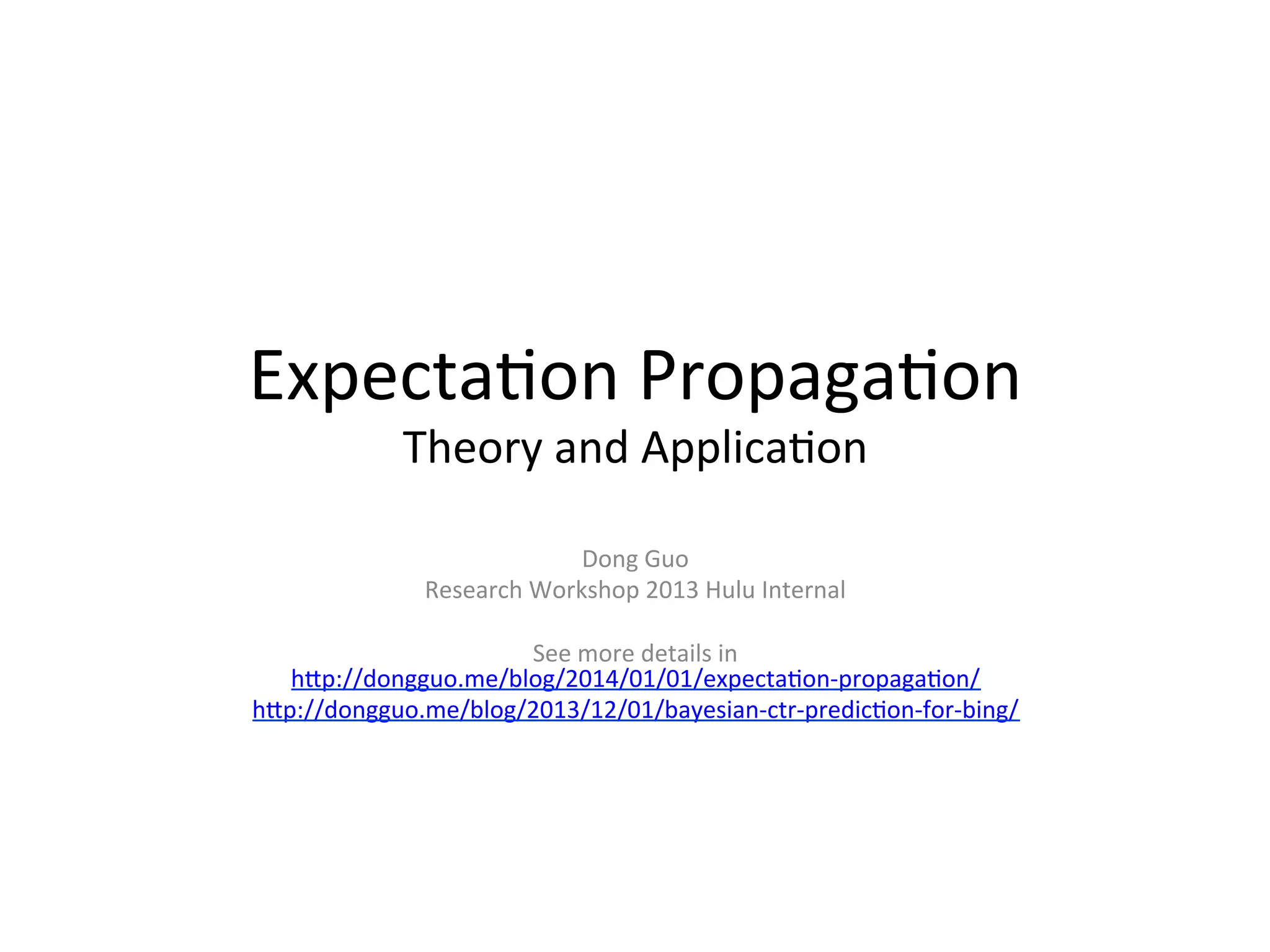 The document discusses the Expectation Propagation (EP) theory and its applications in Bayesian inference, particularly in graphical models and machine learning. It outlines key components of EP, including message passing, factor graphs, and the relationship between variable nodes, and illustrates the method with examples and applications, such as Bayesian click-through rate prediction for Microsoft's Bing. References include essential literature on machine learning and Bayesian methods, including frameworks for Bayesian inference.